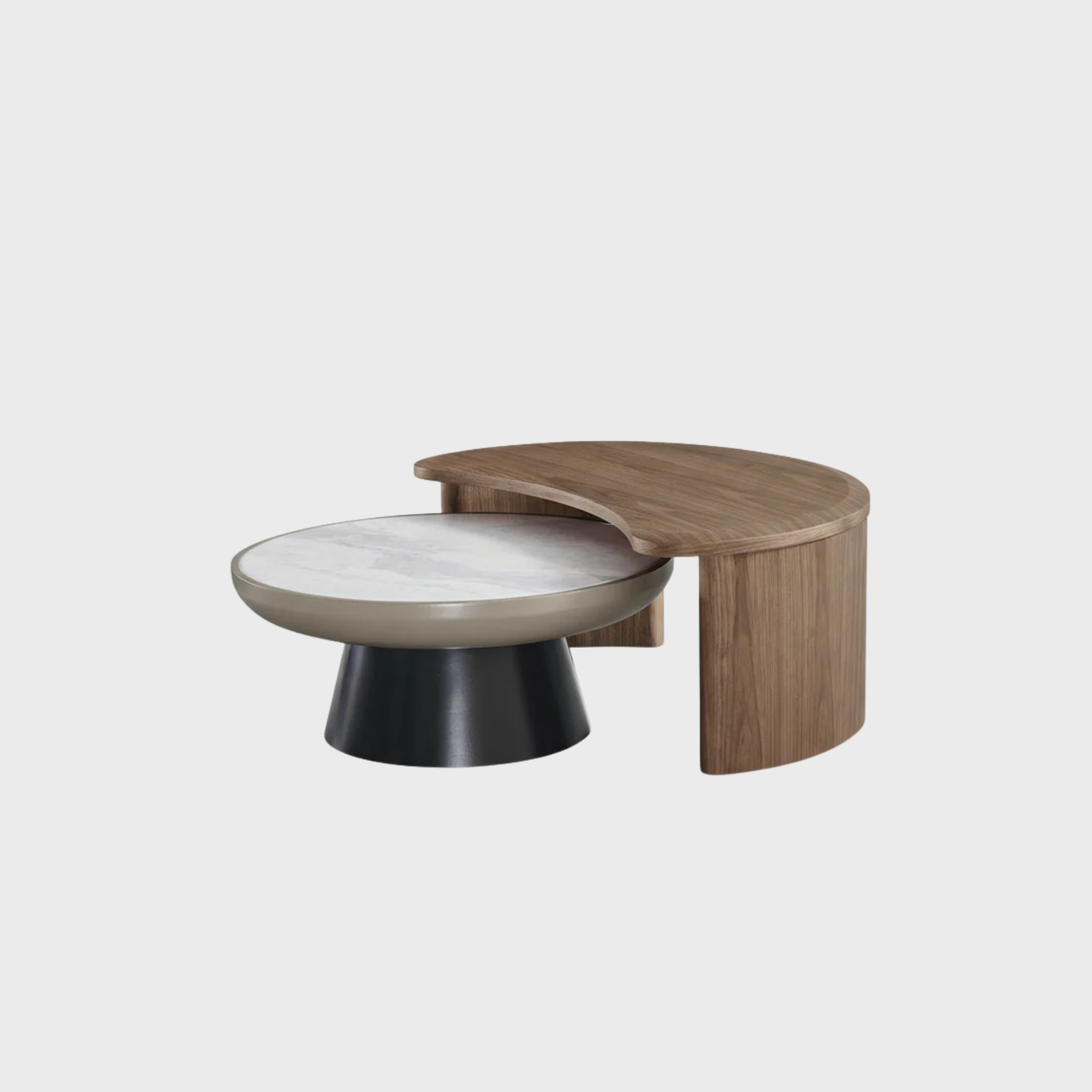 A quietly striking duo that layers warm wood with cool stone-look texture. The crescent table wraps the round pedestal like an embrace, creating sculptural depth you can expand for entertaining or tuck together for a clean, gallery look. Softly radiused edges, a waterfall curve, and a low, grounded profile bring an effortless modern calm to living spaces—from Japandi to contemporary loft.