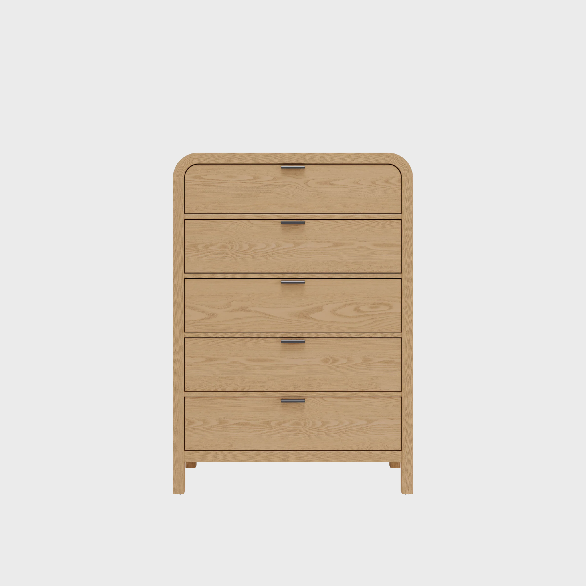 Its tall profile provides five spacious drawers to keep clothing and essentials neatly organized without taking up too much floor space. Crafted from durable timber veneer and solid wood, this chest combines timeless style with everyday function.