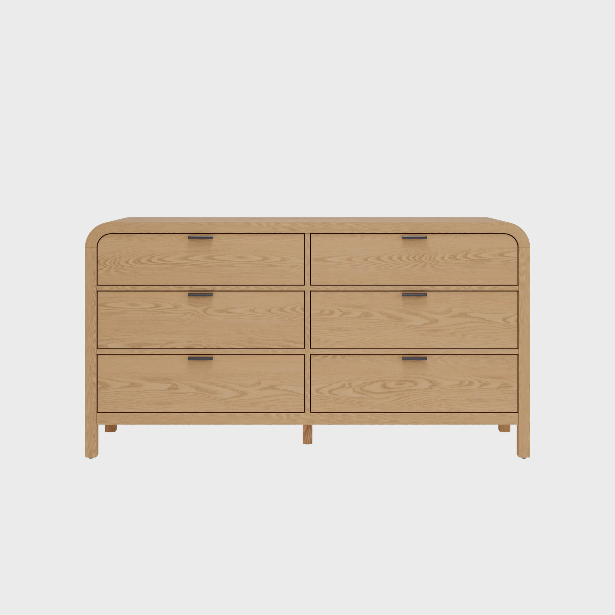 The Drake Dresser – Timber pairs timeless design with everyday functionality. Its rounded corners, visible wood grain, and warm natural finish echo the look of the Drake Bed, creating a cohesive bedroom set.