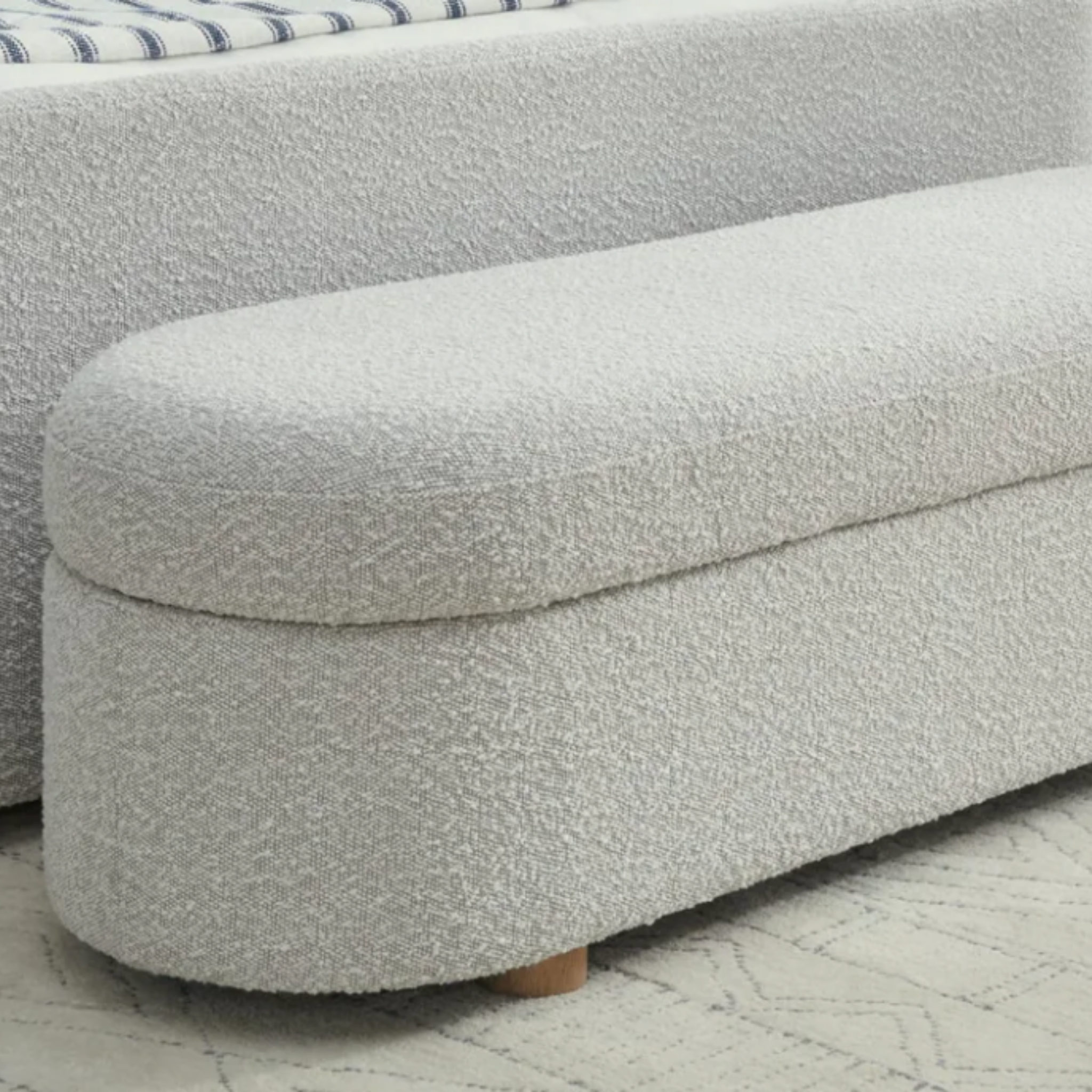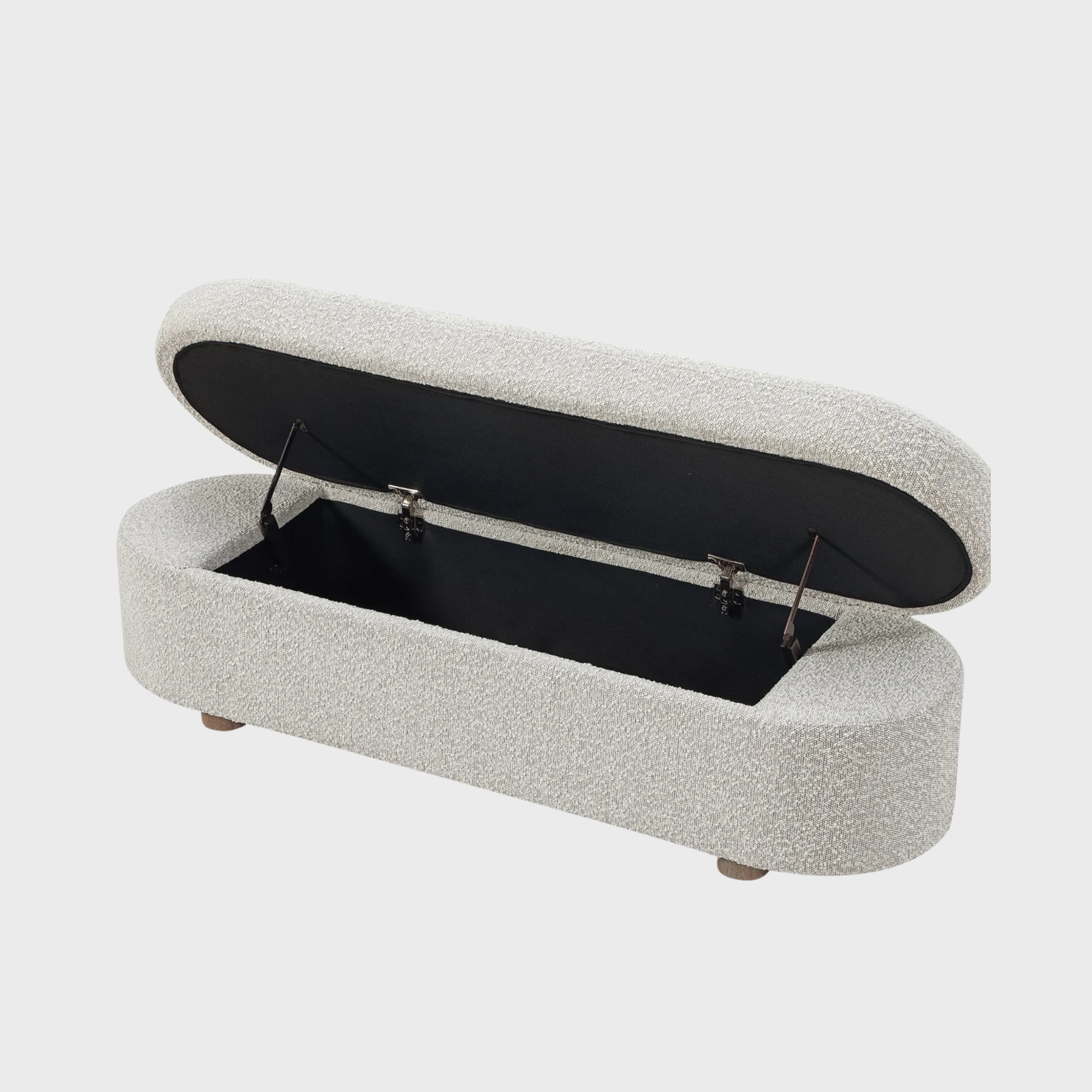 A soft, modern storage solution designed to complement the Kiki collection. Wrapped in easy-care Cotton Ball boucle, this bench offers hidden storage with a smooth hinged lid—perfect for bedrooms, entryways, or living spaces.