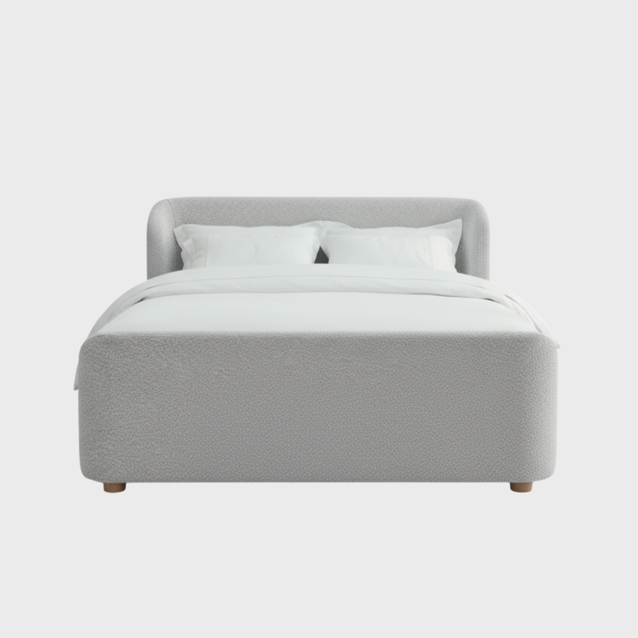 The Kiki Upholstered Platform Bed brings modern softness and sculptural comfort to any bedroom. Wrapped in easy-care boucle fabric, its curvaceous silhouette and shelter-style headboard create a cozy, inviting retreat. Designed for durability and everyday practicality, it features sturdy wood construction and a platform support system that eliminates the need for a box spring.