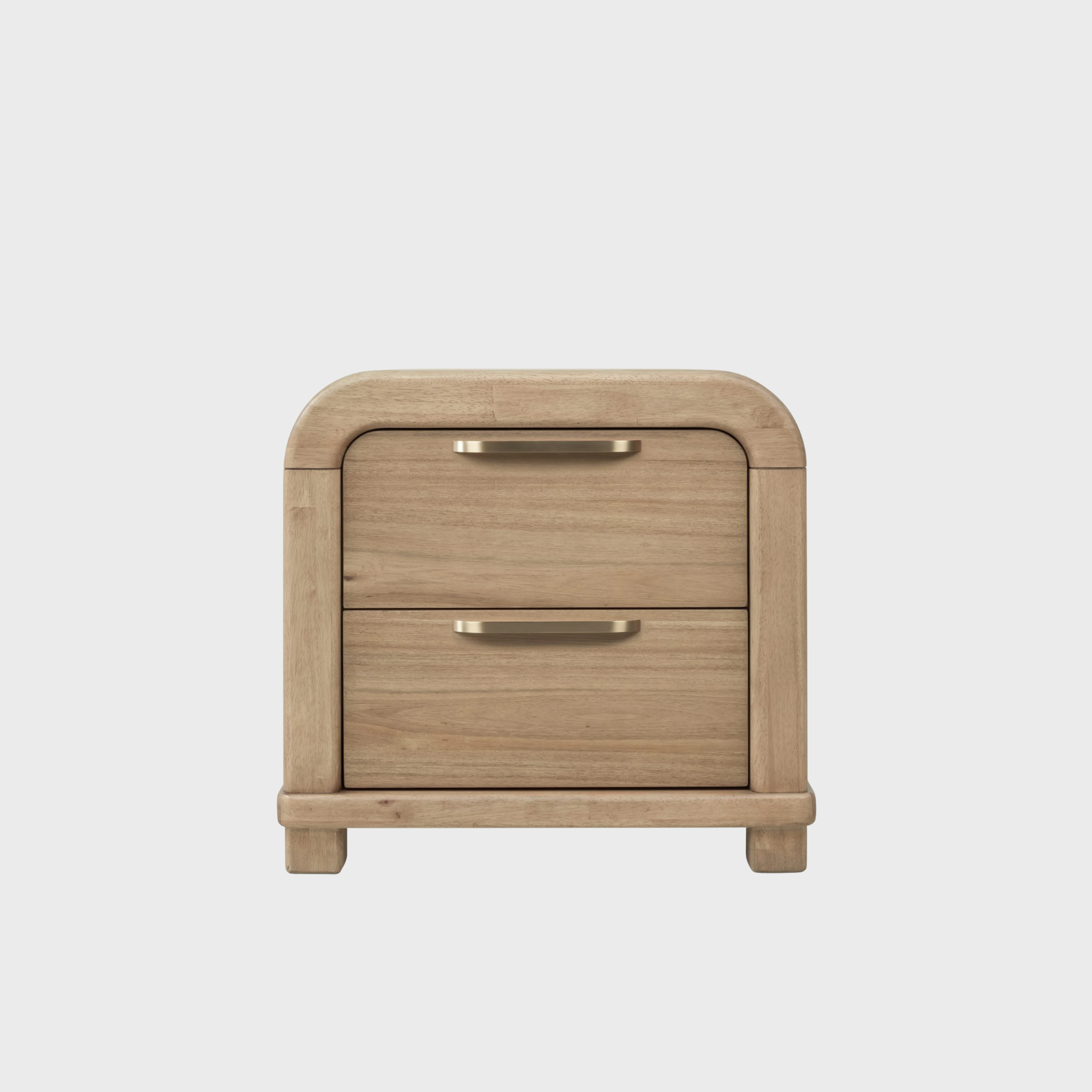 A modern nightstand crafted from natural acacia wood, featuring a smooth, light finish that highlights its warm grain patterns. The rounded edges and soft corners give it a contemporary, relaxed look, balanced by two spacious drawers for practical bedside storage. Each drawer is accented with sleek brushed-gold handles, adding a touch of understated elegance. Supported by sturdy block legs, this nightstand brings both style and function to any bedroom setting.