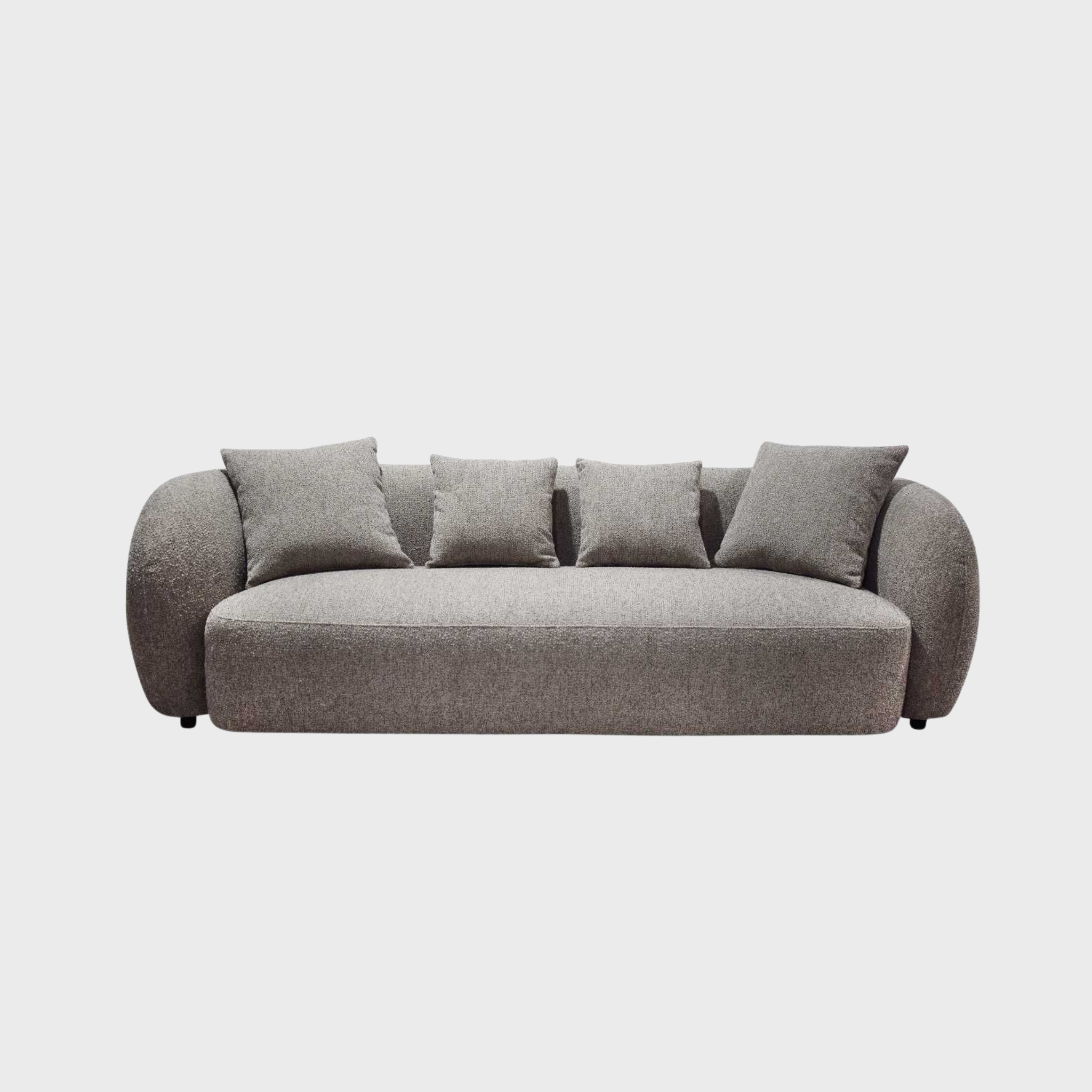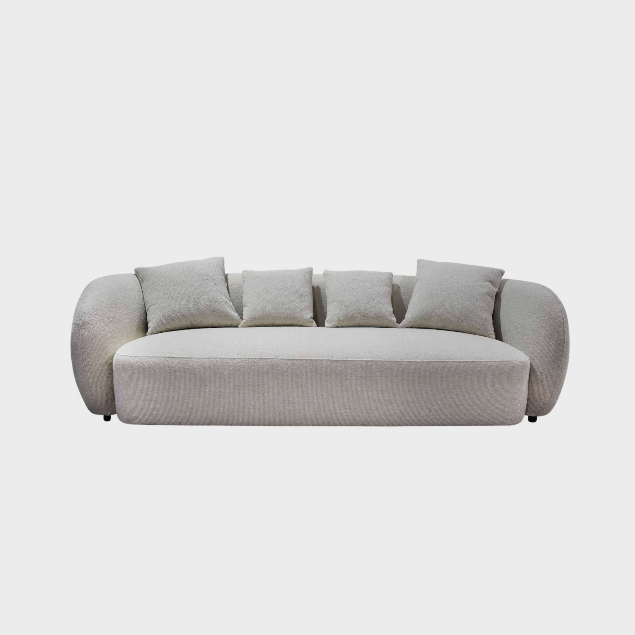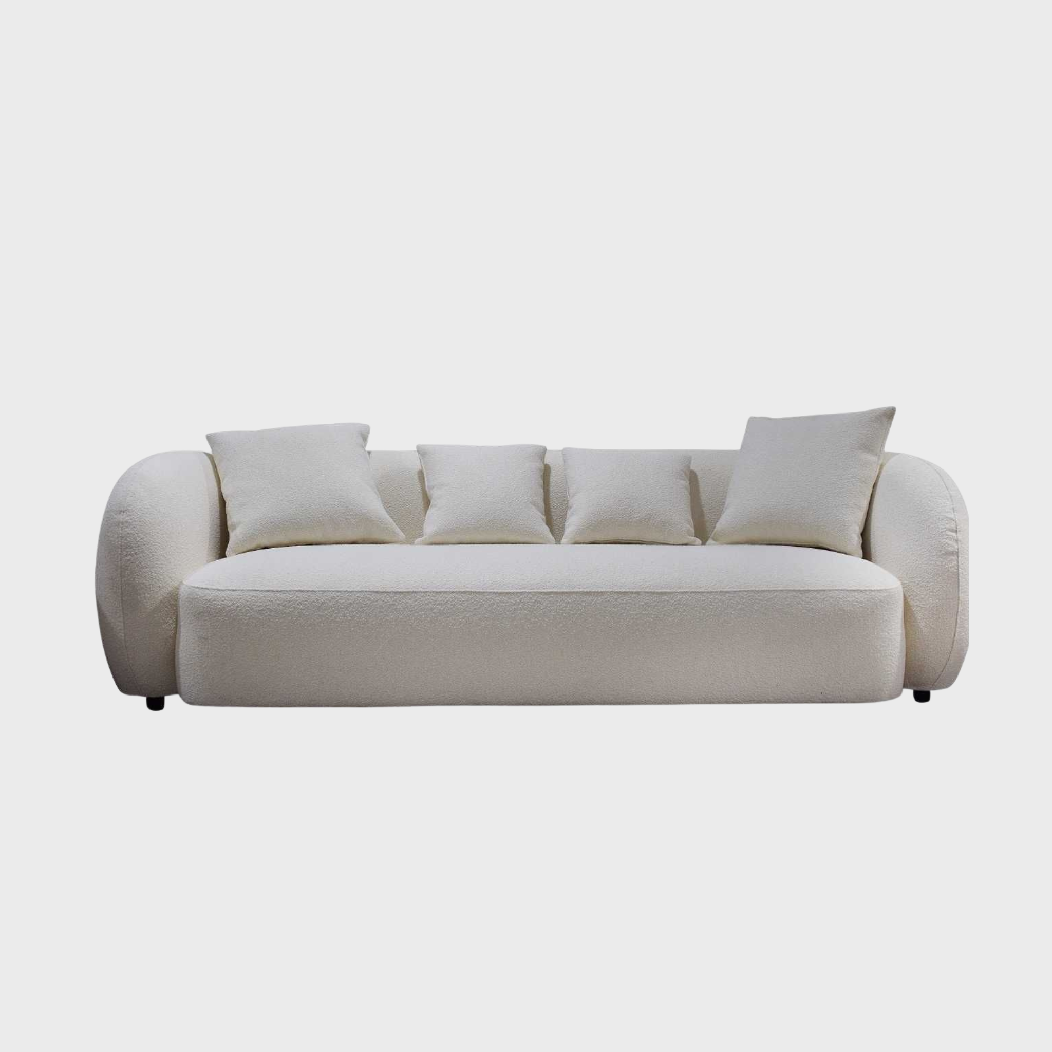 This sofa features a sophisticated, organic silhouette with deep seating and rounded bolster arms for premium lounging comfort. It is upholstered in a durable, cream-toned bouclé fabric that offers a soft, tactile finish designed to withstand the demands of a contemporary home. The minimalist design is completed with four matching accent pillows, providing a cohesive and inviting focal point for any modern living space.