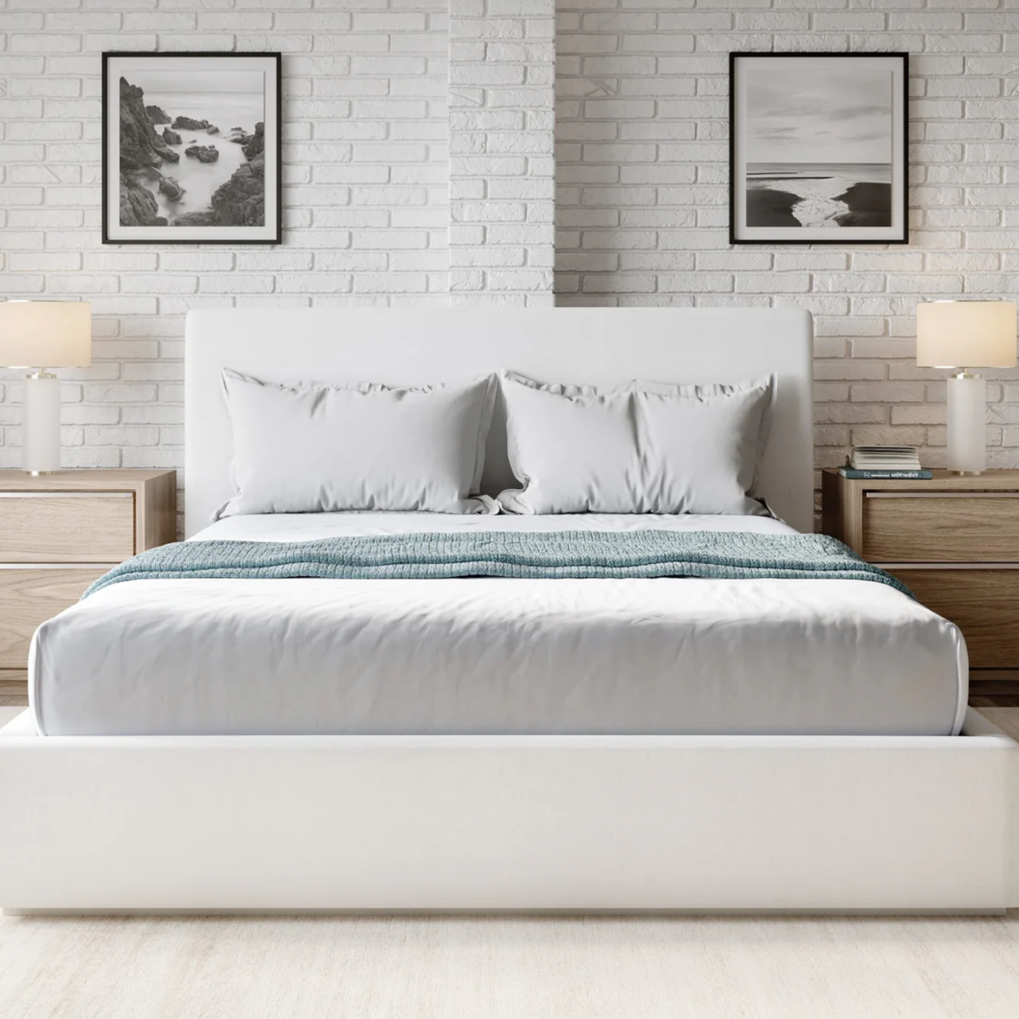 A modern upholstered bed designed with bold proportions, tight tailoring, and easy-care performance fabric. The Pearl finish adds a soft, clean look that elevates any bedroom. Built with hidden footboard storage, durable metal-to-metal rail fittings, and a sturdy platform design—no box spring needed. Bentwood slats, a metal center rail, and support legs ensure long-term stability. Upholstered in 98% polyester and 2% nylon; cleaning code W for simple maintenance.