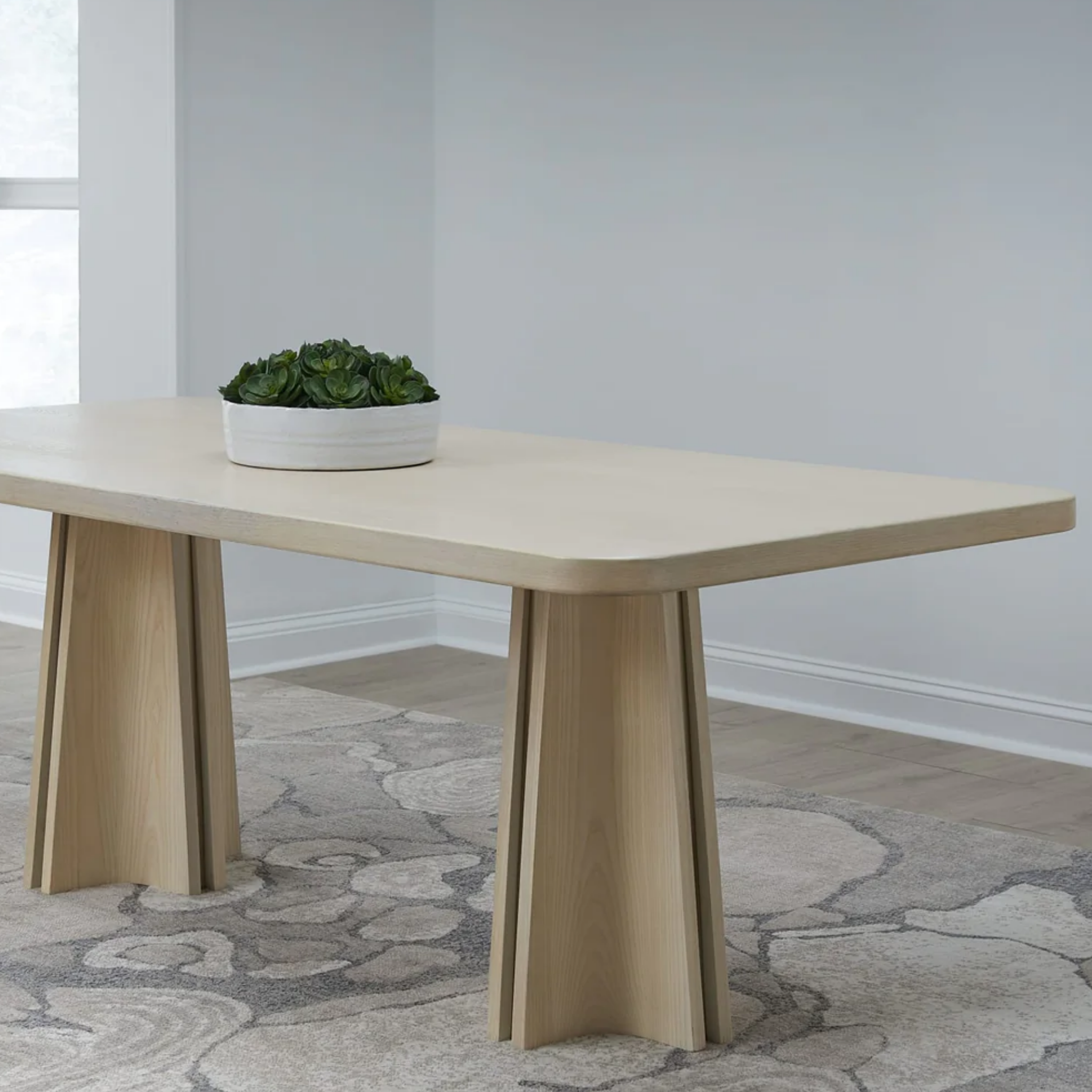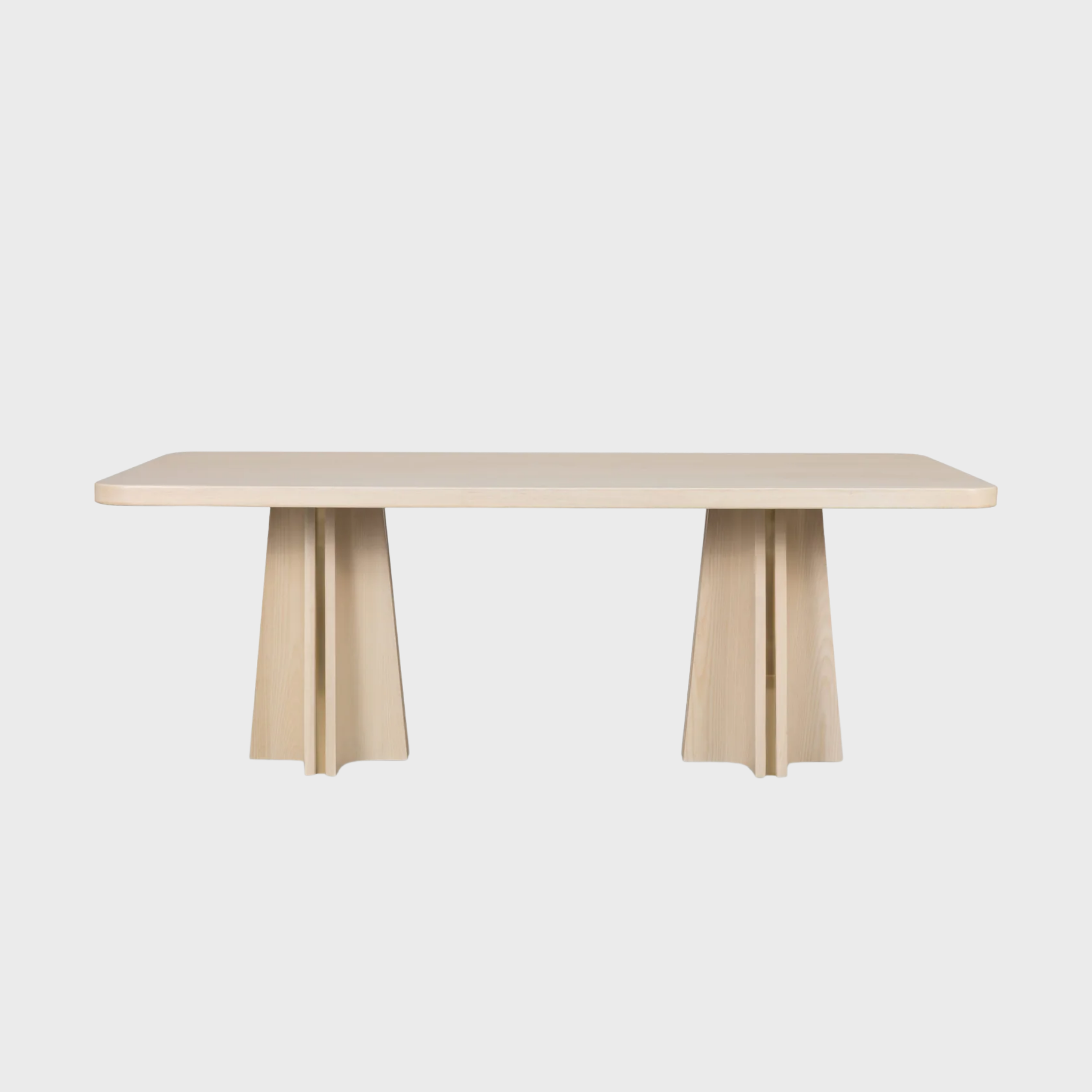 A modern statement piece, the Zinnia Dining Table features sculpted double pedestals with brass-tone accents, a solid wood-edged top, and a smooth White Sand finish. Crafted from Ash veneer and Rubberwood, it seats 8 comfortably and brings warm, refined style to any dining space.